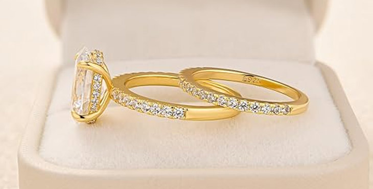 Effinny’s 5.5ct oval ring set features 3x thicker 14K gold plating over sterling silver for lasting shine and durability. Hand-polished cubic zirconia stones deliver exceptional sparkle and ethical quality.